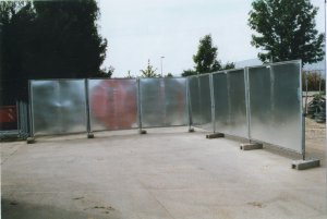 Feuerschutzwand Bestehend aus RAGG-ZACK-Mobilzaunelementen Metallplatten in Rahmen L 2,00m x H 2,20m Aufgestockt bis 6m Höhe