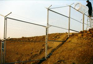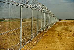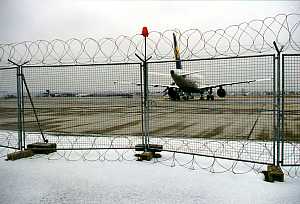 Temporärer Hochsicherheitszaun Bestehend aus RAGG-ZACK-Mobilzaunelementen L 3,00m x H 2,20m verschraubt in Bodenhülsen Zubehör: Natodrahtaufnahme