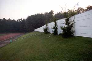 Blickdichter Schutzzaun Bestehend aus RAGG-ZACK-Zaunelementen L 3,50m x H 2,00m mit Sichtschutz und Schrägabstützung in Bodenhülsen montiert